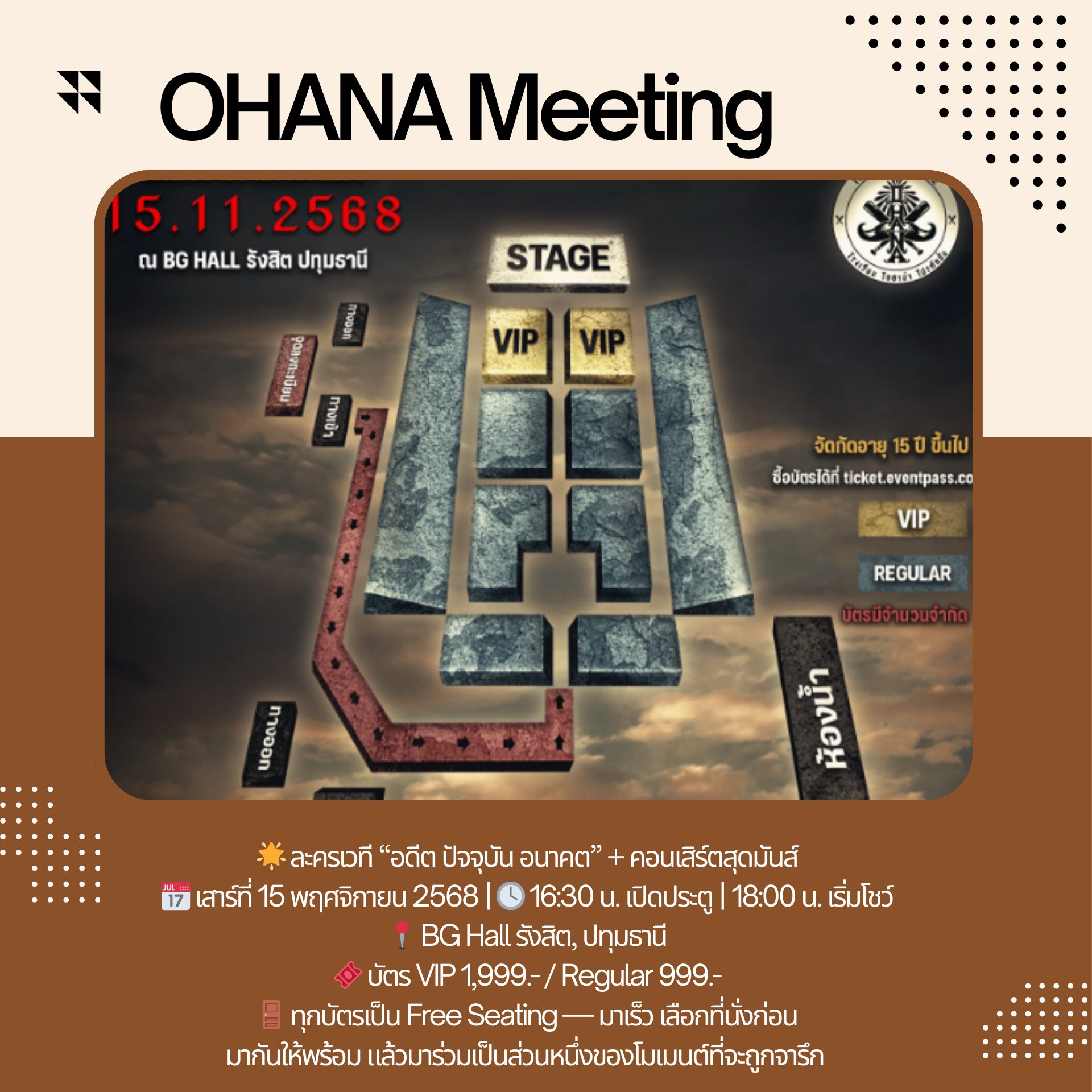 📅 รายละเอียดงาน • วันเสาร์ที่ 15 พฤศจิกายน 2568 • 🕓 16:30 น. เปิดประตู • 🎤 18:00 น. เริ่มโชว์ • 📍 สถานที่: BG Hall รังสิต, ปทุมธานี