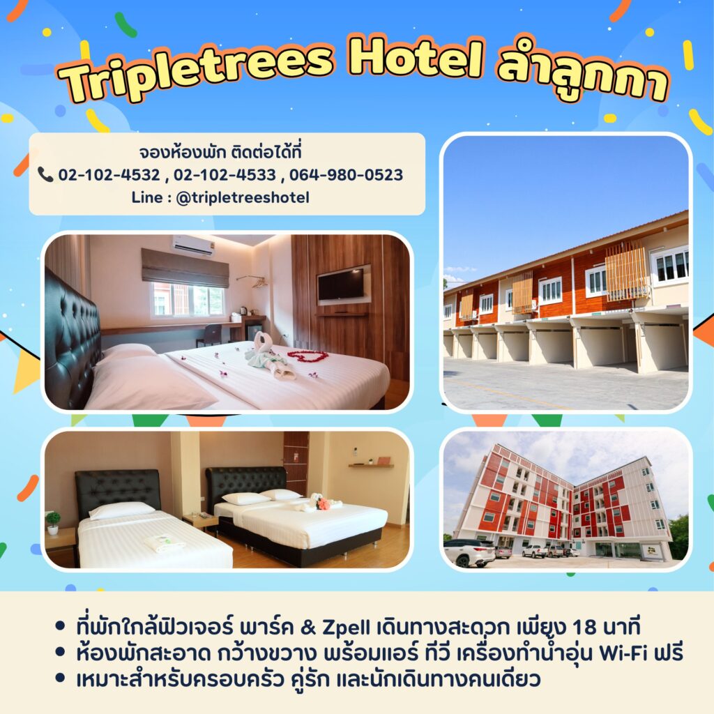 สำหรับสายเที่ยวต่อ แนะนำ Triple Trees Hotel ที่พักราคาหลักร้อย ย่านลำลูกกา เดินทางจากฟิวเจอร์พาร์คเพียงประมาณ 18 นาที ห้องพักสะอาด เรียบง่าย คุ้มราคา เหมาะทั้งสายชิล สายกิน หรือคนที่มาเดินงานแล้วไม่อยากรีบกลับ ใครที่กำลัง หาที่พักใกล้ฟิวเจอร์พาร์ค หาโรงแรมใกล้ฟิวเจอร์พาร์ค หาห้องพักใกล้ฟิวเจอร์พาร์ค หาที่พักรายวันใกล้ฟิวเจอร์พาร์ค หาห้องพักรายวันใกล้ฟิวเจอร์พาร์ค ตัวเลือกนี้ตอบโจทย์ทั้งราคาและความสะดวก
