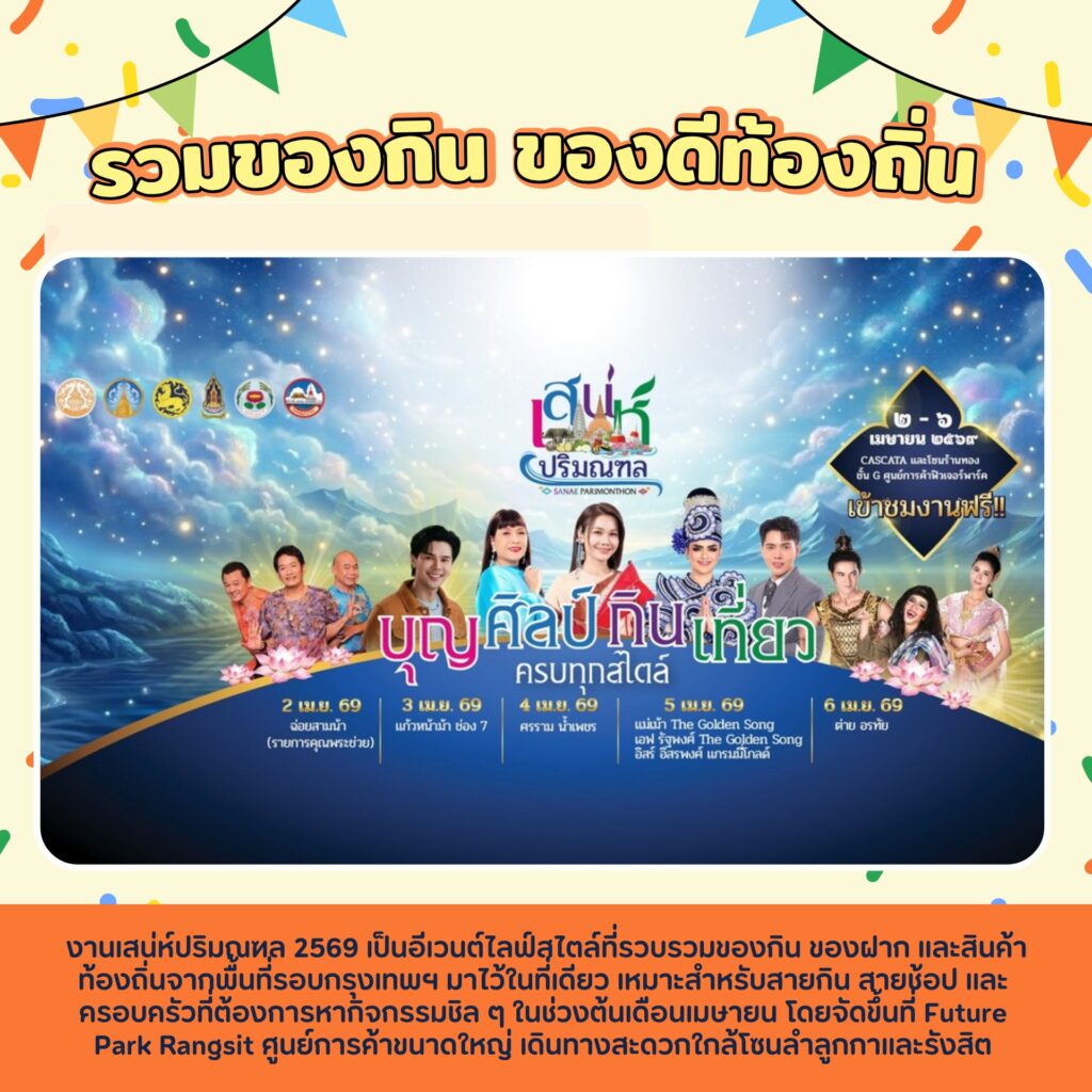 ถ้าใครกำลังมองหาที่เที่ยวใกล้กรุงแบบครบจบในที่เดียว ทั้งกิน ช้อป และเดินเล่นสบาย ๆ งาน เสน่ห์ปริมณฑล 2569 ที่ Future Park Rangsit คือคำตอบ ลงตัวทั้งสายกิน สายช้อป และครอบครัวที่อยากใช้เวลาชิล ๆ ในห้างเย็นสบาย