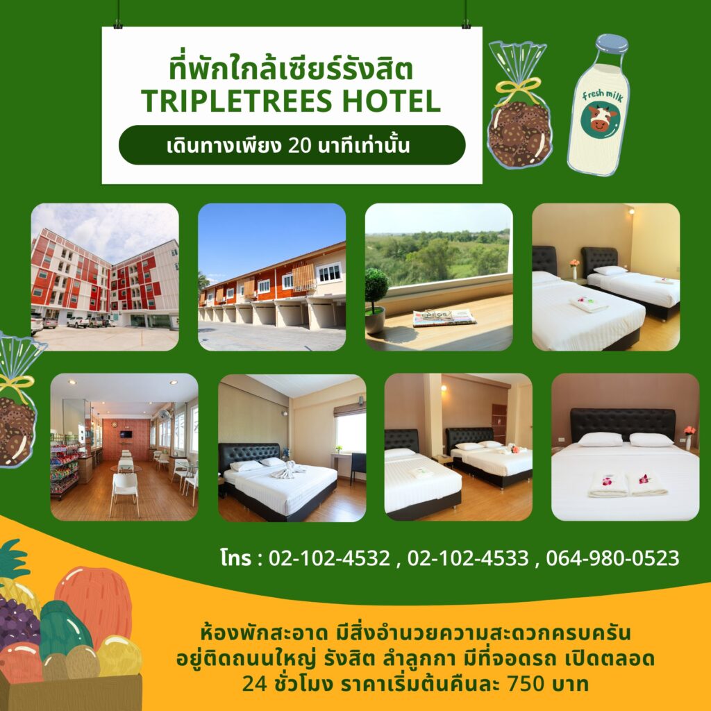 ✨ แนะนำที่พักใกล้เซียร์ รังสิต สำหรับใครที่อยากเที่ยวงานหลายวัน หรือมาจากต่างจังหวัดแล้วมองหาที่พักใกล้ ๆ เราขอแนะนำ Triple Trees Hotel โรงแรมราคาหลักร้อยใกล้เซียร์ รังสิต ที่พักรายวันใกล้เซียร์ รังสิต ห้องพักชั่วคราวใกล้เซียร์ รังสิต ที่พักราคาประหยัดใกล้เซียร์ รังสิต แต่บริการครบครัน ใช้เวลาเดินทางจาก เซียร์ รังสิต เพียง 20 นาที ห้องพักสะอาด เรียบง่าย บรรยากาศเงียบสงบ ฟรี Wi-Fi และสิ่งอำนวยความสะดวกมาตรฐาน ราคาเบา ๆ เหมาะกับทั้งนักท่องเที่ยวและครอบครัวที่ต้องการพักผ่อนสบาย ถือเป็นที่พักทำเลดี เหมาะกับการเดินทางไปเที่ยวงาน OTOP ชวนชิม และแหล่งท่องเที่ยวอื่น ๆ รอบรังสิต