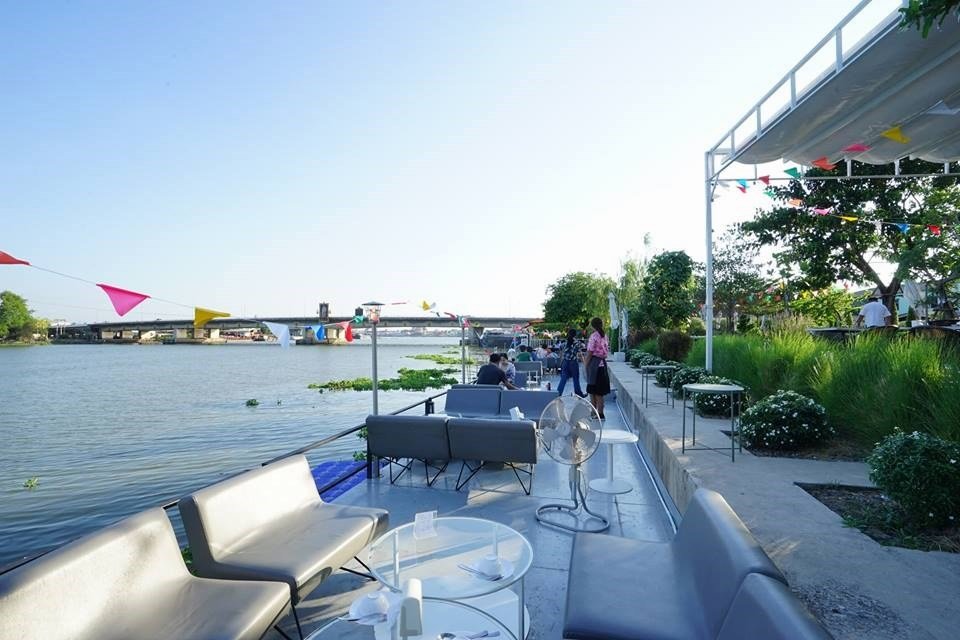 แล้วก็ยังมีโซนโต๊ะนั่งด้านนอกรับลมธรรมชาติเย็นกาย โซนโต๊ะนั่งในสวนสวย ร่มรื่นด้วยแมกไม้น้อยใหญ่ให้ความรู้สึกรื่นรมย์ และมีโซนโต๊ะนั่งริมแม่น้ำเจ้าพระยา ให้ได้ชมวิวแม่น้ำสวยๆ นั่งชิลๆ รับลมธรรมชาติเพลินใจ แถมยังมีดนตรีสดเล่นทุกวัน ตั้งแต่เวลา 18.00 – 22.00 น. ให้ฟังแบบเพลิดเพลินบันเทิงใจ