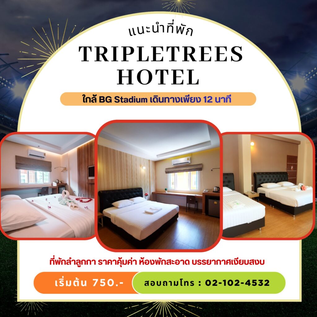 หลังจากสนุกกับแมตช์ใหญ่ที่ True BG Stadium แล้ว มาพักผ่อนสบาย ๆ ที่Tripletrees กันเถอะ! ที่นี่เรามี ห้องพักรายวันลำลูกกา พร้อมสิ่งอำนวยความสะดวกครบครัน และตอบโจทย์ทุกความต้องการ ไม่ว่าคุณจะกำลังมองหา ที่พักรายวันลำลูกกา หรือ โรงแรมรายวันลำลูกกาสำหรับแฟนบอลที่อยากใกล้ชิดสนาม เรามี ที่พักใกล้ BG Stadium, รีสอร์ทใกล้ BG Stadium, และ ห้องพักใกล้ BG Stadium ให้เลือกสรร พักผ่อนอย่างสบายใจและสะดวกต่อการเดินทางกลับบ้าน หากคุณยังกำลัง หาที่พักใกล้ BG Stadium, หาห้องพักใกล้ BG Stadium, หรือ หาห้องใกล้ BG Stadium เรามีตัวเลือกที่ครบครัน พร้อมบริการเป็นกันเอง ทำให้คุณได้เติมพลังหลังจบงานใหญ่