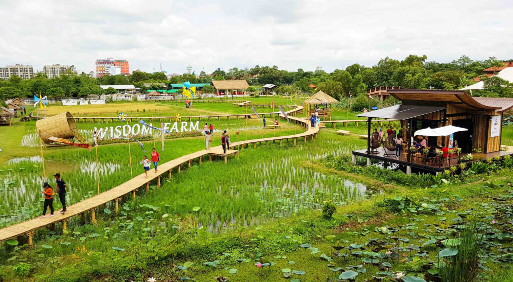 แล้วจะมีทางเดินเป็นสะพานเพื่อให้เดินไปยังจุดชมวิว โดยด้านบนของจุดชมวิวนี้เองทำให้เห็นบรรยากาศของ “Wisdom Farm” ได้โดยรอบ เมื่อทอดสายตาออกไปยังท้องทุ่งนาแล้ว รู้สึกสบายตาสบายใจเหลือเกินจากนั้นชวนมาเดินรับลมชิลๆ กันบริเวณด้านล่างกันต่อ ทางเดินด้านล่างนี้มีจุดเด่นอยู่ที่สะพานไม้ไผ่ ที่ทอดยาวคดโค้งตามเส้นทาง โดยมีทุ่งนาสีเขียวขจีให้ได้แวะถ่ายรูปกับมุมโปรด ระหว่างทางจะมีเสาไม้ไผ่ประดับด้วยผ้าสีสันต่างๆ อย่างสวยงาม เมื่อเดินไประยะหนึ่งจะพบกับศาลาไม้ เป็นจุดแวะพักให้ได้มานั่งรับลมเย็นๆ กันก่อนที่จะเดินกันต่อ