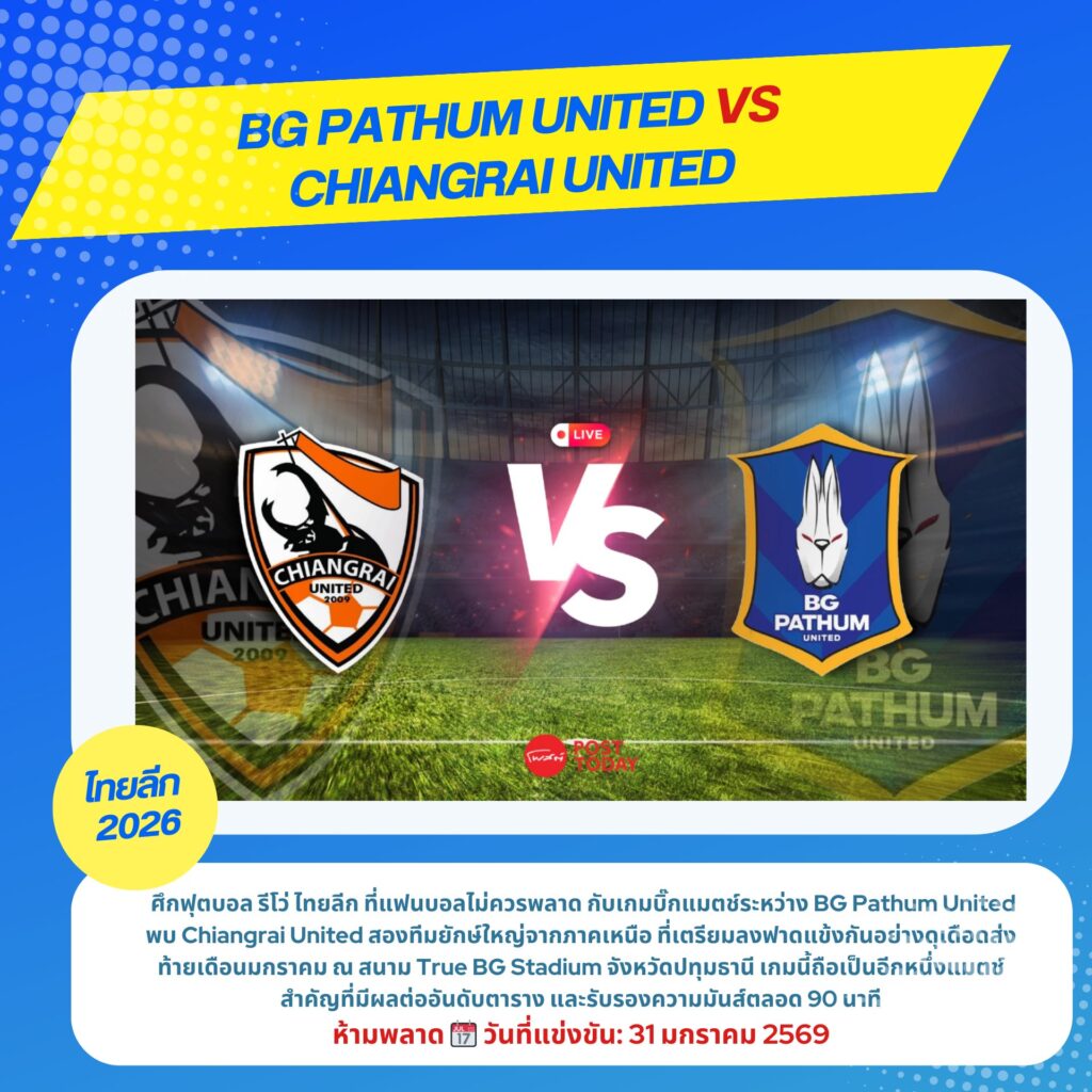 ศึกฟุตบอลที่แฟนบอลรอคอยกำลังจะระเบิดความมันส์อีกครั้ง กับการแข่งขันไทยลีกคู่สำคัญ BG Pathum United พบ Chiangrai United การดวลกันของสองทีมแกร่ง ที่เต็มไปด้วยคุณภาพนักเตะ แท็กติกเข้มข้น และเกมที่ลุ้นกันทุกจังหวะ ตั้งแต่นาทีแรกจนเสียงนกหวีดสุดท้าย