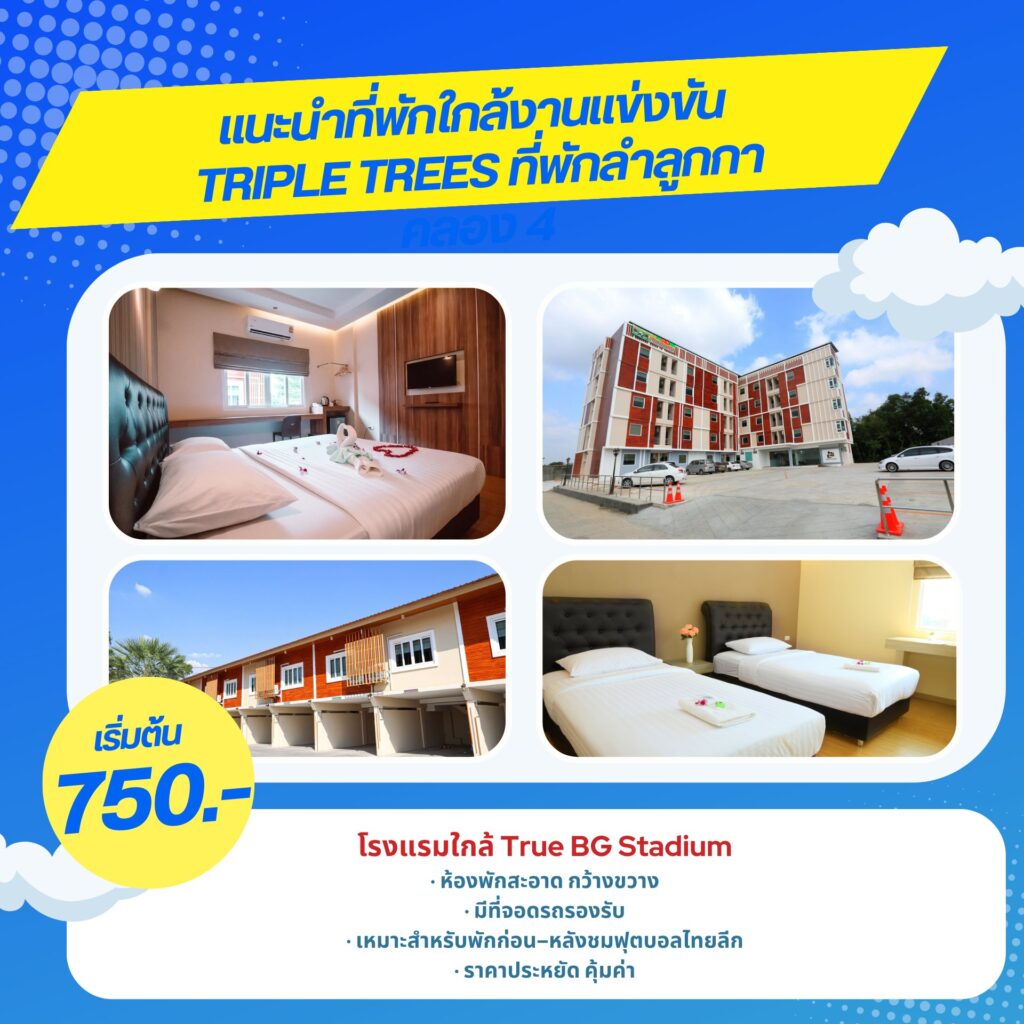 สำหรับแฟนบอลที่เดินทางมาจากต่างพื้นที่ หรืออยากพักใกล้สนามเพื่อความสะดวก ขอแนะนำ โรงแรม Tripletrees ที่พักย่านลำลูกกา ราคาหลักร้อย เดินทางไป True BG Stadium ใช้เวลาเพียงประมาณ 12 นาที เท่านั้น เหมาะสำหรับแฟนบอลที่อยากหลีกเลี่ยงรถติด และพักผ่อนแบบสบาย ๆ หลังจบเกม โรงแรม Tripletrees เป็นตัวเลือกที่ตอบโจทย์ทั้งความคุ้มค่าและทำเล เหมาะสำหรับผู้ที่มองหา ที่พักลำลูกกา โรงแรมลำลูกกา ห้องพักลำลูกกา และห้องพักรายวันลำลูกกา รวมถึงผู้ที่ต้องการ ที่พักใกล้ BG Stadium โรงแรมใกล้ BG Stadium ห้องพักใกล้ BG Stadium หรือกำลังหาที่พักใกล้ BG Stadium และที่พักใกล้บีจีสเตเดียมแบบเดินทางง่าย