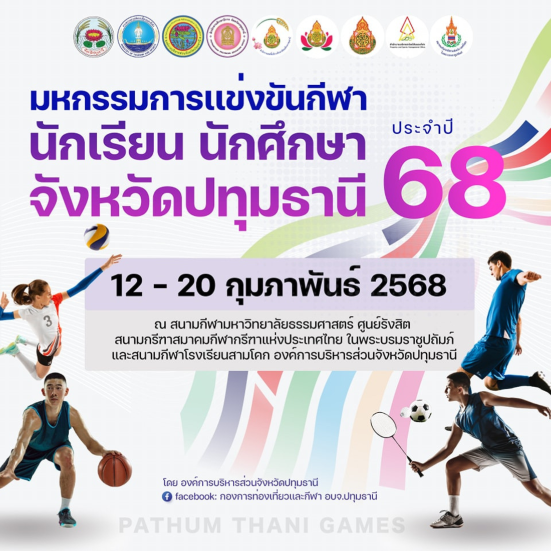 📢ขอเชิญชวนทุกท่านร่วมงาน "มหกรรมการแข่งขันกีฬา จ.ปทุมธานี ประจำปี 68" Pathumthani Games กองการท่องเที่ยวและกีฬา องค์การบริหารส่วนจังหวัดปทุมธานี