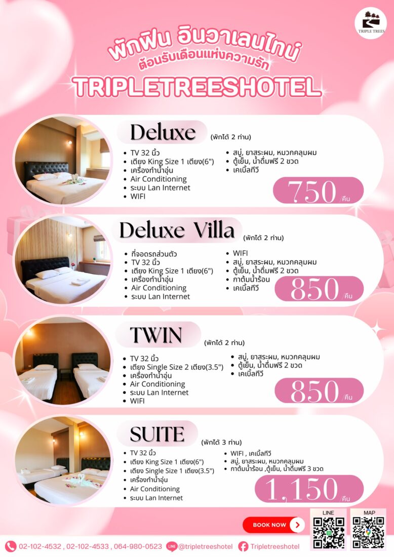 วาเลนไทน์ปีนี้ Tripletreeshotel ขอเป็นส่วนหนึ่งที่ช่วยให้วันพิเศษของคุณราบรื่นและอุ่นใจมากยิ่งขึ้น เพียง จองตรงกับโรงแรม ก็หมดกังวลทุกเรื่อง พร้อมพักผ่อนอย่างสบายใจในบรรยากาศอบอุ่น เป็นส่วนตัว