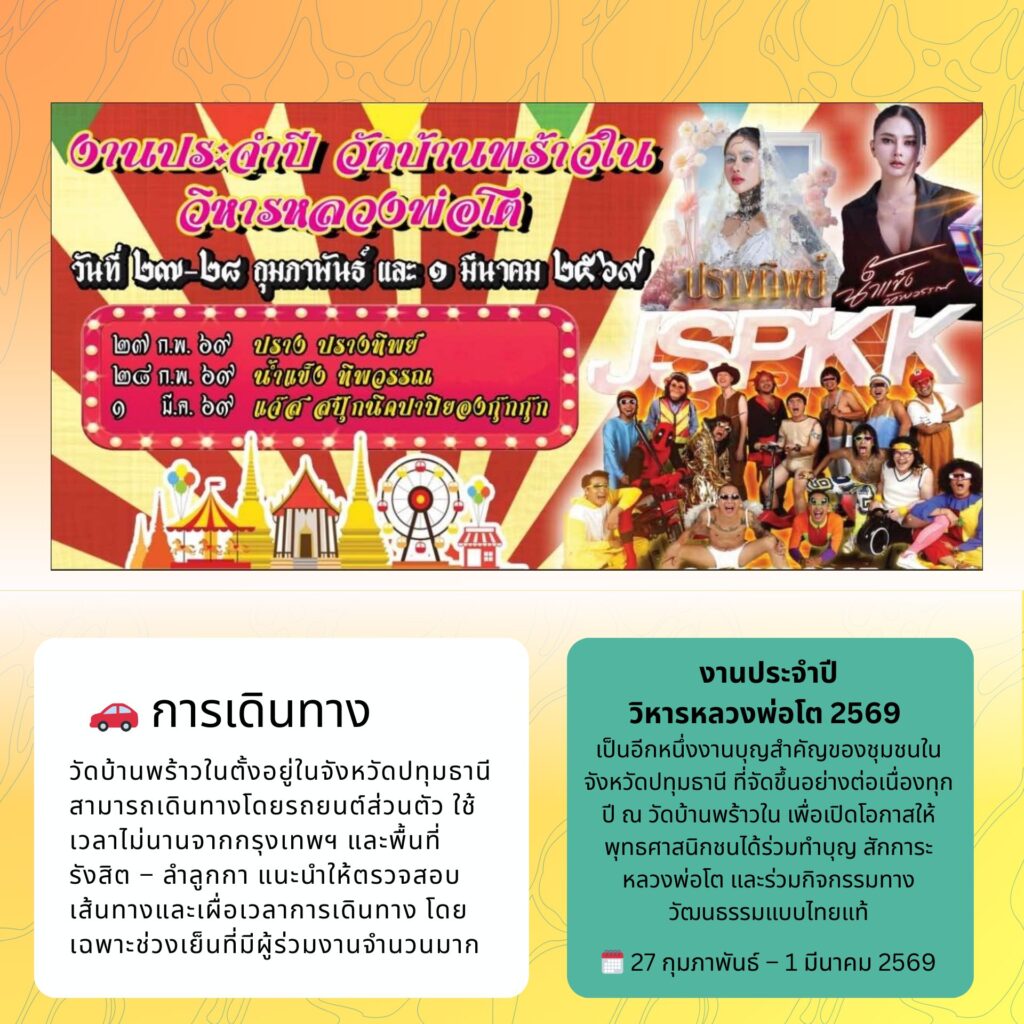 🛕✨ ขอเชิญร่วมงานบุญประจำปี “วิหารหลวงพ่อโต 2569” ณ วัดบ้านพร้าวใน จังหวัดปทุมธานี ระหว่างวันที่ 27 กุมภาพันธ์ – 1 มีนาคม 2569