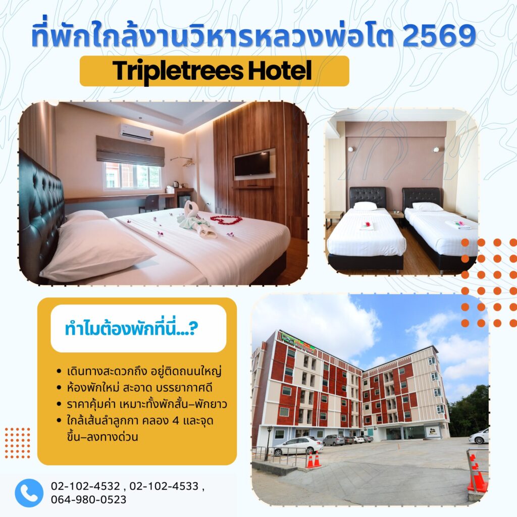 สำหรับผู้ที่กำลังมองหา ที่พักใกล้งานประจำปี วิหารหลวงพ่อโต หรือ โรงแรมที่พักใกล้งานประจำปี วิหารหลวงพ่อโต ในโซนลำลูกกา ขอแนะนำ Triple Trees โรงแรมหลักร้อยที่คุ้มค่าและเดินทางสะดวกใช้เวลาเดินทางจากสถานที่จัดงานประมาณ 35 นาที เหมาะสำหรับครอบครัวหรือผู้ที่ต้องการพักผ่อนหลังร่วมงานบุญตลอดทั้งวัน ห้องพักสะอาด บรรยากาศเงียบสงบ พร้อมสิ่งอำนวยความสะดวกครบครันการเลือก ที่พักใกล้งานประจำปี วิหารหลวงพ่อโต จะช่วยให้คุณไม่ต้องเร่งรีบเดินทางไกล สามารถใช้เวลาในงานได้เต็มที่ และกลับมาพักผ่อนอย่างสบายใจ