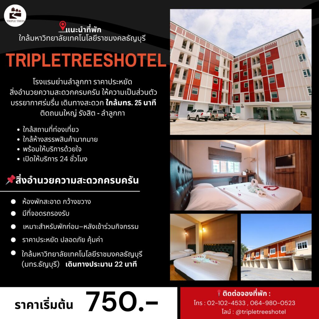 TripletreesHotel เป็น โรงแรมแนะนำปทุมธานี ที่ได้รับความนิยมจากผู้เข้าพักอย่างต่อเนื่อง ด้วยห้องพักที่สะอาด เป็นระเบียบ บรรยากาศเงียบสงบ เหมาะกับทั้งผู้ที่มองหา โรงแรมใกล้มหาวิทยาลัย เพื่อเข้าร่วมงานสัมมนา หรือผู้ที่ต้องการ ที่พักรายวันใกล้มหาวิทยาลัยเทคโนโลยีราชมงคลธัญบุรี สำหรับการพักผ่อนระยะสั้น
