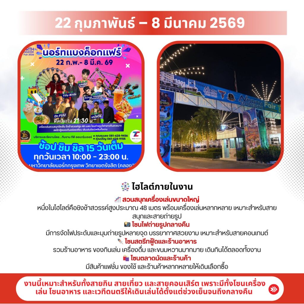 บรรยากาศภายในงานเต็มไปด้วยสีสันแบบงานวัดไทยแท้ ทั้งซุ้มเกมสุดคลาสสิก ของกินสตรีทฟู้ดแน่นๆ และมุมถ่ายรูปกลิ่นอายสงกรานต์ ใครที่กำลังมองหา งานวัด, สงกรานต์, สรงน้ำพระ แบบชิลๆ เดินสบายในแอร์ ต้องมาที่นี่